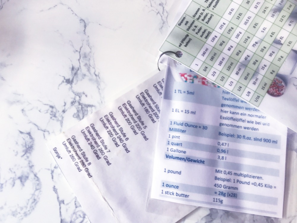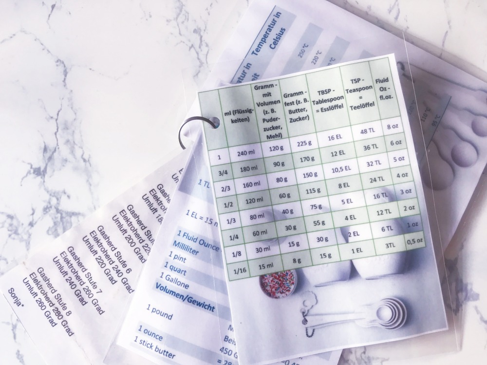 Soooo, und nun habe ich etwas Besonderes für euch: Meine Tabellen! Druckt sie euch aus und bewahrt sie einfach in der Küche auf. ich habe sie laminiert und noch ein paar andere Zettelchen dazu gepackt, wie meine Ofentemparturen bei meinem alten Gasofen etc.