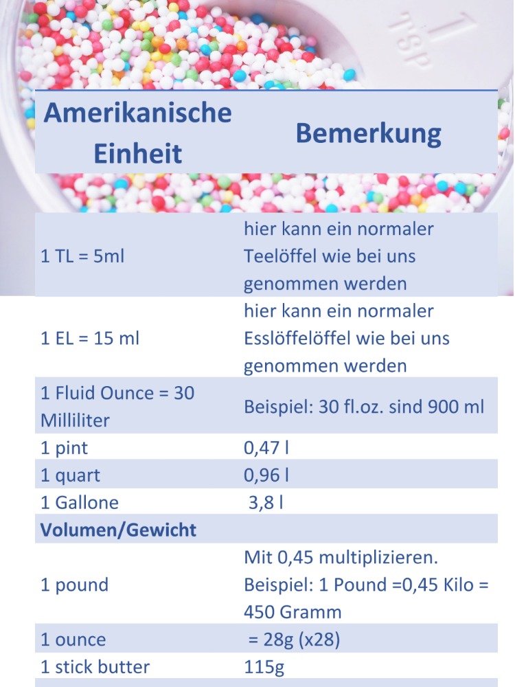 Ganz wichtig: Das amerikanische Cup-Maß sind ca. 236,58 ml, wir rechnen aber mit 240 ml. Das englische Cup ist jedoch ca. 284 ml, also um einiges mehr. Also immer schön schauen, woher das Rezept stammt!