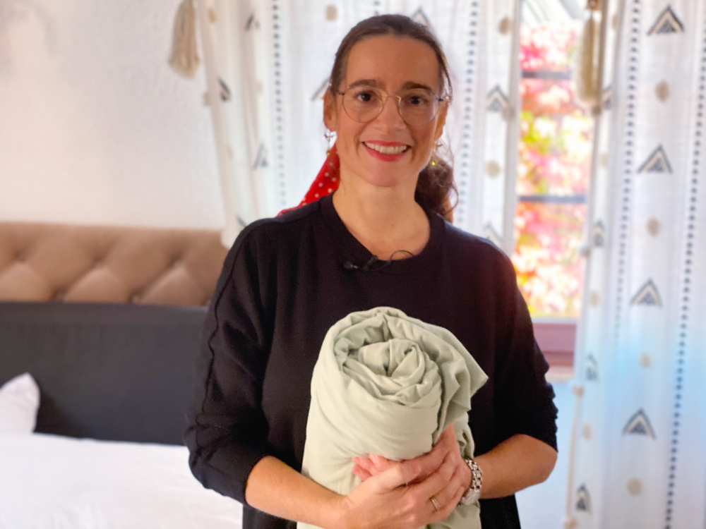 Das klingt jetzt komplizierter als es ist, aber du kannst alles noch mal im Video nachschauen – und natürlich auch das Video zum Falten des Spannbetttuchs.