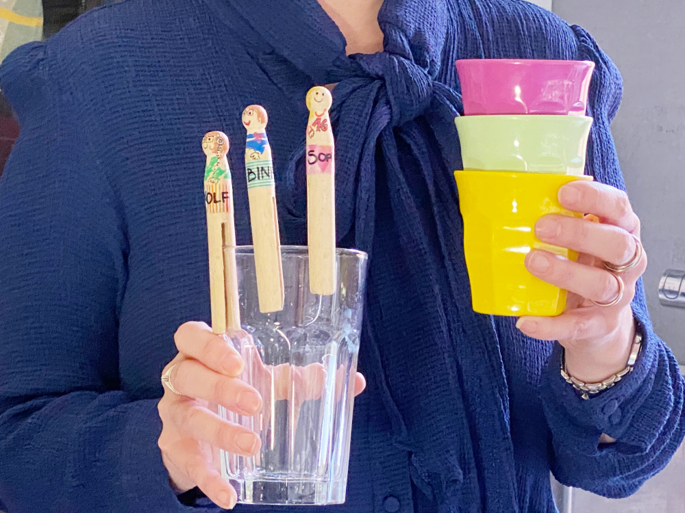 Der erste Schritt natürlich: Weniger dreckiges Geschirr produzieren. Das funktioniert bei uns so: Gläser und Becher werden markiert – z.B. mit Wäscheklammern. Bei kleinen Kindern kann man einen Farbcode entwickeln (Brotdose, Becher , Schüsselchen hat alles sie selbe Farbe – funktioniert übrigens auch super bei Wäsche), wobei jede Farbe einer bestimmten Person zugeordnet wird. So vermeidet man schon mal die Unmengen an Geschirr, die dadurch entstehen, dass sich immer wieder etwas Neues aus dem Schrank geholt wird.