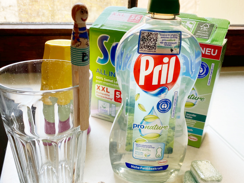 Übrigens: Pril nutze ich schon seit denken kann – bei uns klebten die bunten Prilblumen überall in der Küche meiner Kindheit. Spannend finde ich übrigens das Pril aus der pro nature-Serie. Die Formel ist zu 95,5% aus Inhaltsstoffen natürlichen Ursprungs, bei gleichzeitig hoher Fettlösekraft. Besonders cool ist jedoch, dass man seine Flasche quasi schon kennen könnte. Denn in ihr wurden ihre Geschwister verarbeitet, die man schon mal im Haushalt hätte haben können. Denn sie besteht aus 100% recyceltem Plastik, wovon 50% aus sogenanntem Social Plastic®, gesammelt am Strand und Land, sind.