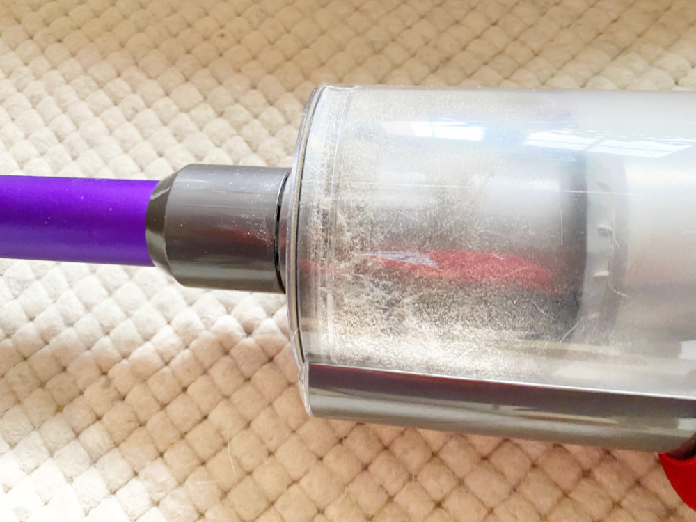Erschreckend finde ich übrigens, wie viele Haare er aus einem Teppich rausbekommt, den ich für sauber halte … In seinem durchsichtigen Auffangbehälter sieht man das immer sehr gut. Der ultimative Test sind unsere (wirklich hässlichen) Teppichfliesen in unserem Treppenhaus. Sie sind Kackbraun (ja, ihr wolltet die ungeschönte Wahrheit) und haben seltsame Rillen, die kein Haar, kein Dreckbatzen so schnell mehr freigeben. Hundehaare haken sich hier in Nullkommanix fest. Aber auch hier ist der Dyson meine ultimative Waffe, zumal er kabellos auch noch wirklich praktisch im Treppenhaus ist! Wo er an seine Grenzen gerät, sind größere Teile (Scherben etc.). Aber hier geht es ja tatsächlich nur um Haare.
