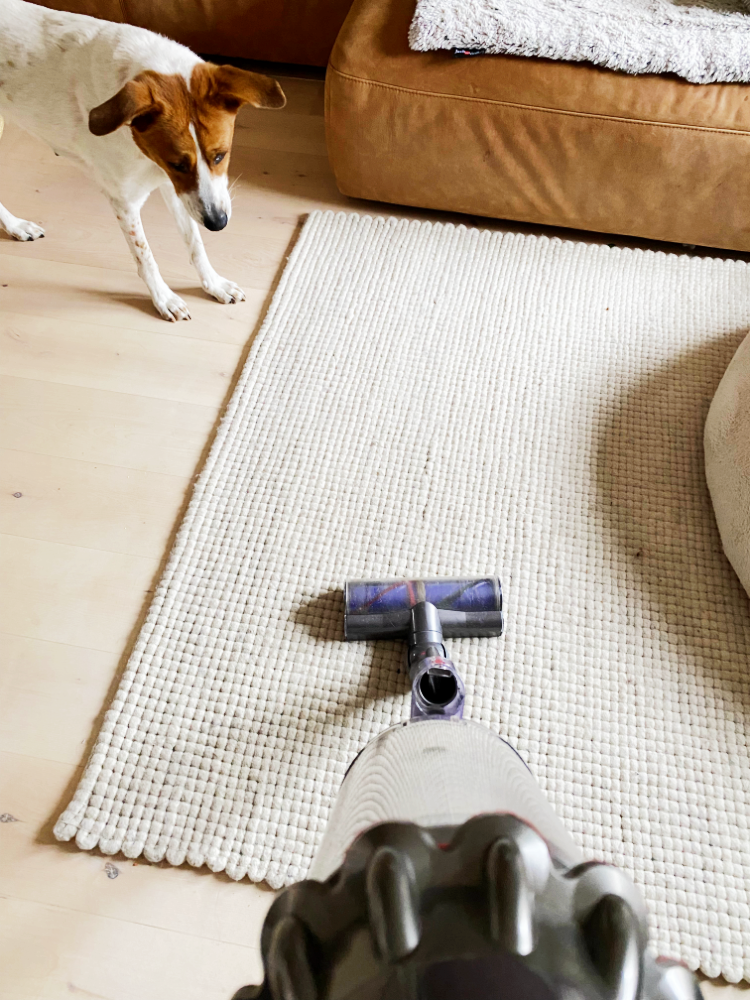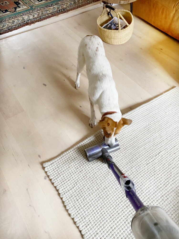 Was wir nutzen? Ok, ich muss gestehen, dass ich ihn jedem empfehle, der nicht bei drei auf den Bäumen ist: meine Wunderwaffe gegen Hundehaare! Vor einem Jahr zog der kabellose Dyson Animal V11 ein. Kein Schnäppchen, aber im Kampf gegen die Haare ein echter Verbündeter. Er hängt bei uns in der Küche und wird täglich an Hotspots eingesetzt. Zugegebener Massen wird er nur von mir so innig geliebt – Frieda mag ihn nicht und versucht ihn jedes Mal in seine Schranken zu weisen. Ich habe schon viele Staubsauger getestet, aber für unsere Bedürfnisse ist er mit Abstand der beste Sauger, wenn es um Hundehaare geht.