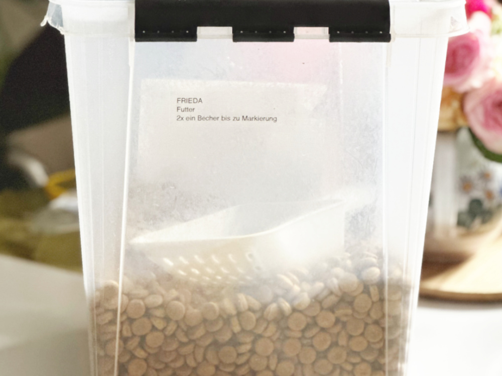 - Struktur: Beschrifte die einzelnen Futtersorten und lagere sie an einem Ort. Beschrifte die Futterbox gleich mit der richtigen Dosierung, damit alle Personen die richtige Menge abfüllen. Für Nassfutter: Ein kleiner Zettel im Kühlschrank für die Portionierung ist super hilfreich.