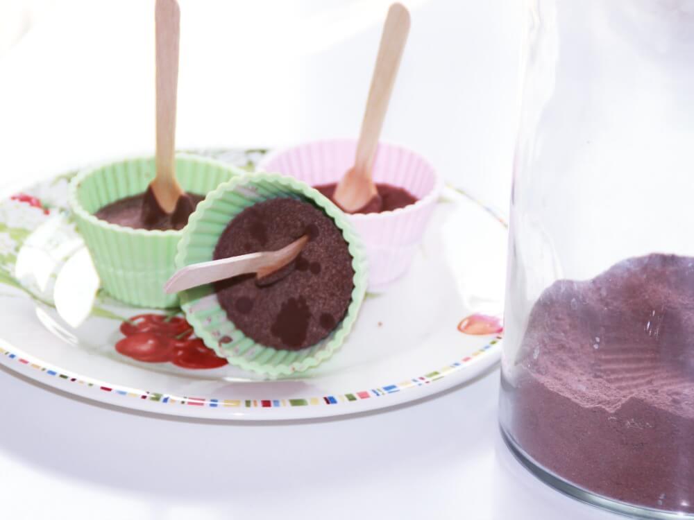 Schön vorsichtig und gleichmäßig rühren, bis die Schokolade glänzt. Dann schnell umfüllen in kleine Silikonförmchen (unsere sind vom Kaffeeröster). Holzlöffelchen rein. Abkühlen. Fertig.