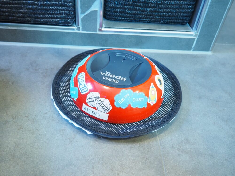 Der Virobi von Vileda ist für das tägliche trockene Staubwischen von harten Böden zuständig. Der automatische Staubwischroboter nimmt dank eingebautem Raumsystem flächendeckend Staub und Haare auf. Das Gerät ändert sofort die Richtung, sobald Objekte und Wände berührt werden. Dank einem flexiblen Außenring reinigt er auch entlang von Kanten und aufgrund der geringen Höhe an Stellen, die sonst nur schwer erreichbar sind, wie z.B. unter Möbeln.