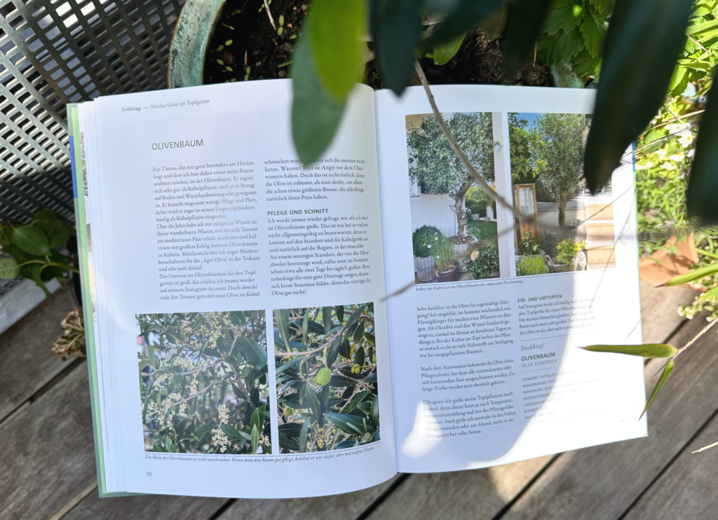 Das Lustige: Ich habe so ein paar Kandidaten im Topf rumstehen, die ich immer Pi x Daumen pflege. Zum Beispiel meine beiden Olivenbäumchen, die im Winter Schafwolle umbekommen. Ob das sinnvoll ist? Keine Ahnung. Und meine Hortensien, die ich fast ertränke. Und genau diesen Pflanzen widmet sie sich ausführlich in ihrem Buch und ich kann endlich nachlesen, ob ich kompletten Quatsch veranstalte.