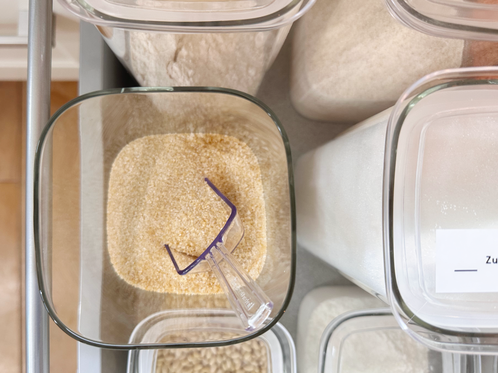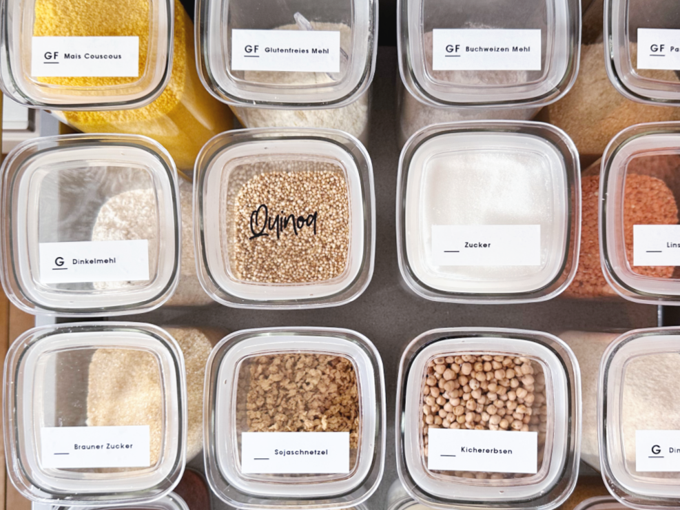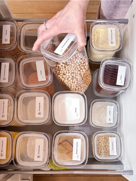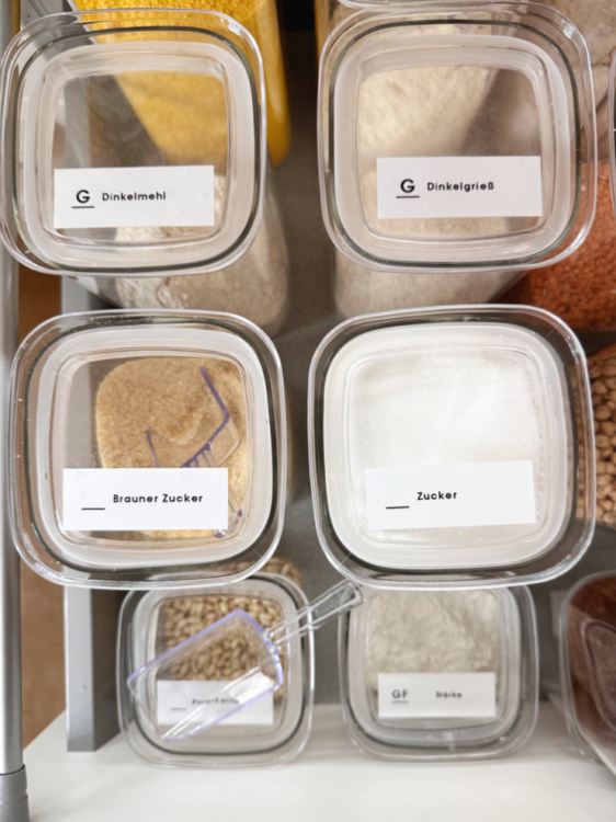 Das Umfüllen von Lebensmitteln in große Behälter hilft aber nicht nur, den Überblick zu behalten, sondern erleichtert auch die Verwendung im täglichen Leben. Den Zucker aus einem Glas zu löffeln, geht einfach sehr viel leichter als aus einer kippeligen und angerissenen Tüte, die man nicht wieder richtig verschließen kann.