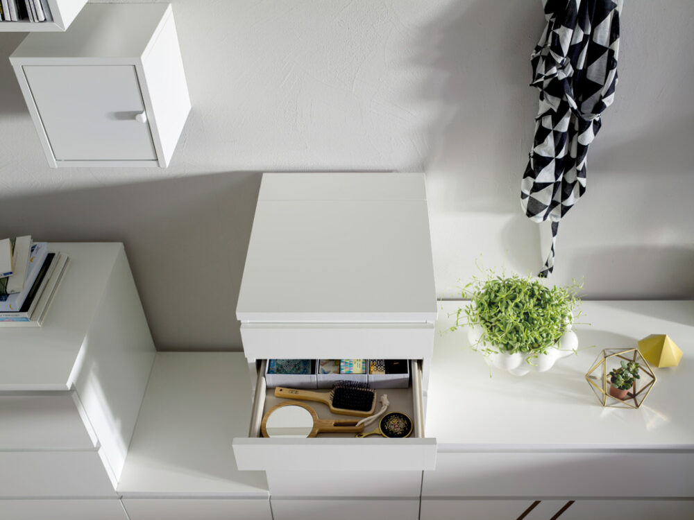 In Schubladen oder im Kleiderschrank sorgt die SKUBB Serie bestens für Ordnung im Schlafzimmer mit Ikea. Die Boxen und Hängeaufbewahrung gibt es in verschiedenen Größen für Kleidung, Schuhe und Zubehör. Ist alles am passenden Platz, findet man alles schnell, ohne zu suchen. Außerdem lassen sich die Boxen flach zusammenklappen und platzsparend verstauen, wenn sie nicht benötigt werden.
