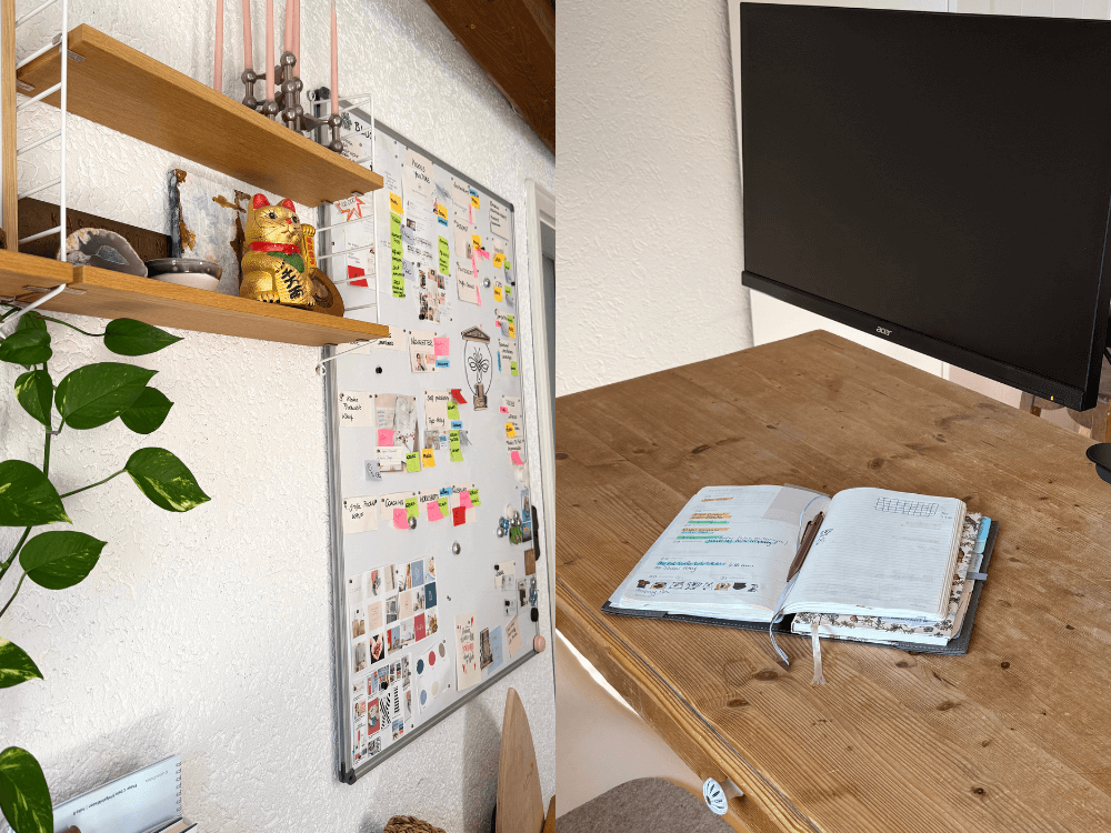 - Arbeitszonen einrichten: Organisiere deinen Schreibtisch und weise bestimmten Bereichen eine Funktion zu, zum Beispiel eine Zone für den Computer, eine zum Schreiben und eine für Notizen. Die wichtigsten Utensilien, die du regelmäßig brauchst, platzierst du um den Computer herum, sodass sie immer griffbereit sind.