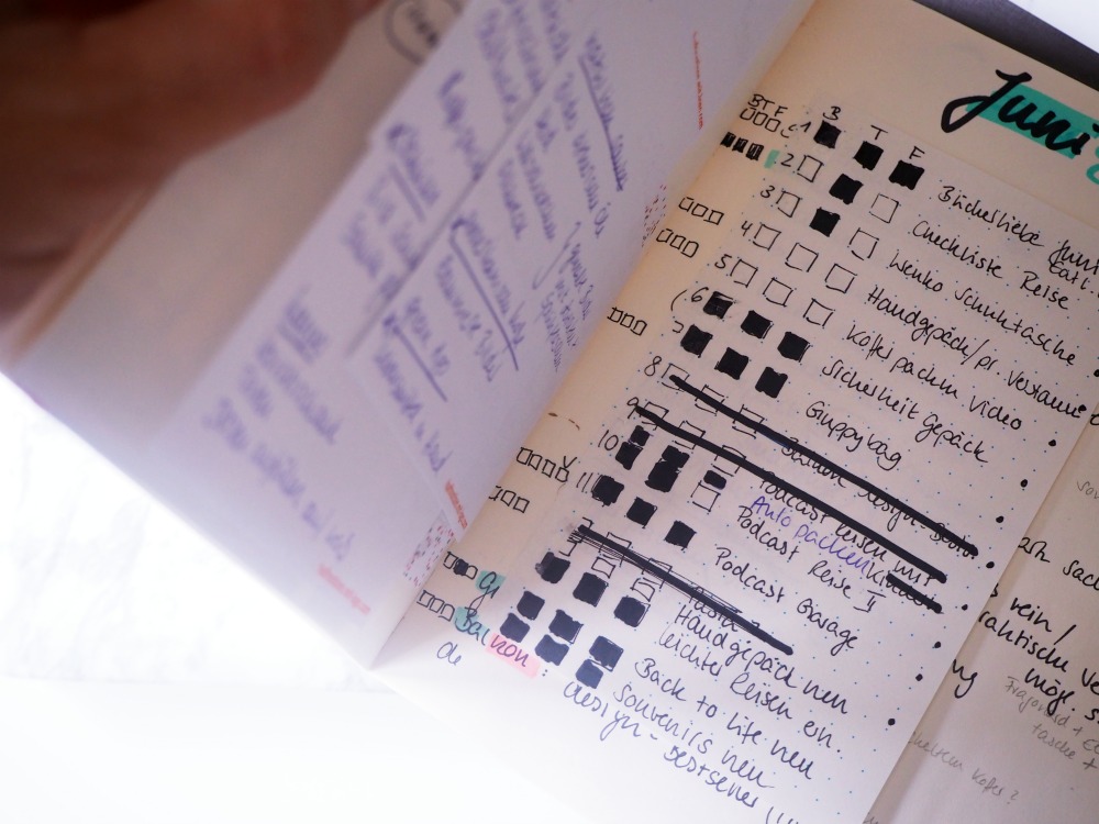 Und da ich ja, wie schon erwähnt, sehr visuell bin, habe ich mir an das Bulletjournal-System angelehnt ein Abhaksystem geschaffen. Ich habe zu jedem Artikel 3 bis 5 Kästchen, die ich nach Erledigung einfärbe: