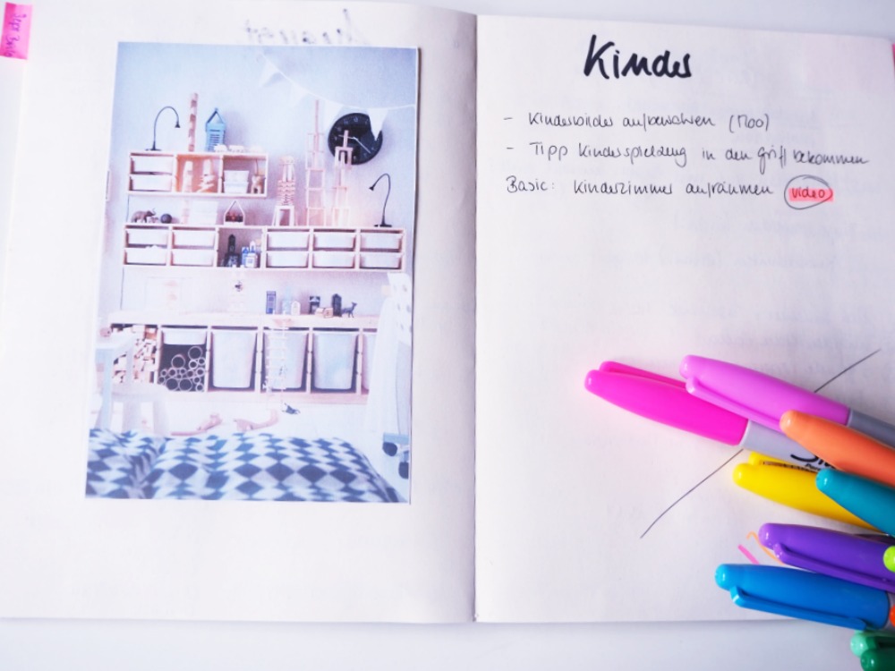 Und wenn ich dann einen Monat mit einem Thema planen – zum Beispiel Kinderzimmer aufräumen – dann „bastel“ ich mir aus all den Inspirationen die Themen zusammen. Das geht dann wirklich, wirklich schnell und ich habe ohne große Recherche 5 bis 10 Themen parat.