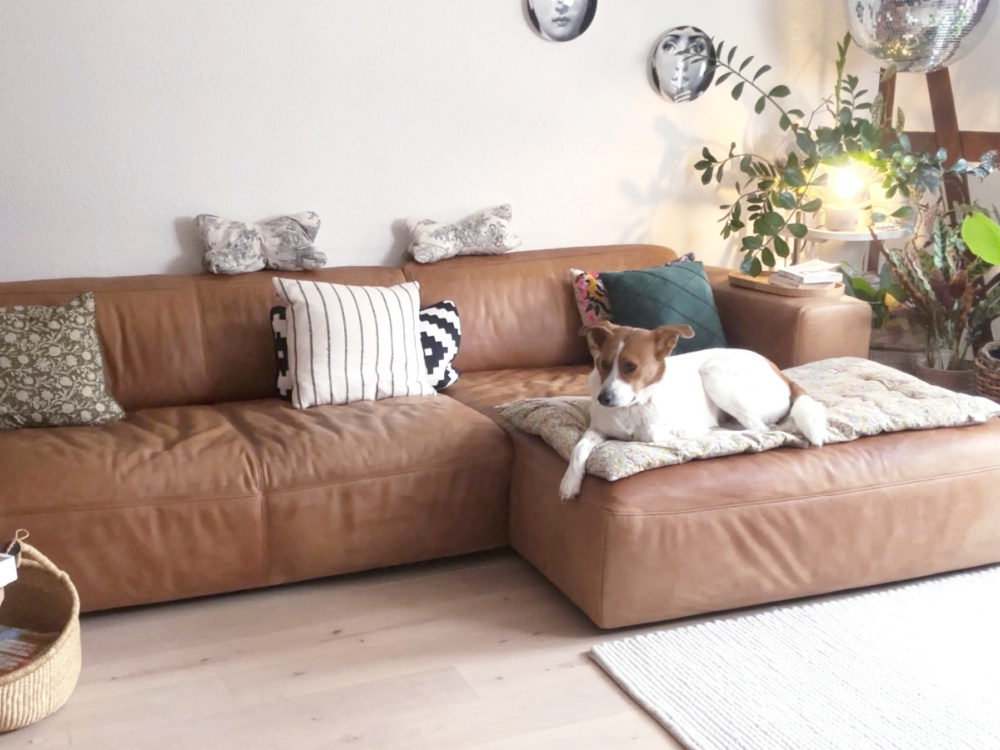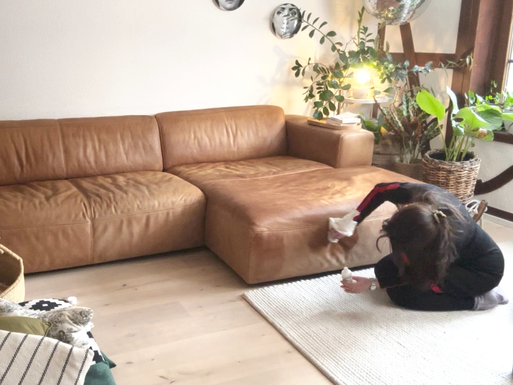 Der letzte große Punkt ist unser Sofa. Es ist aus Leder und bekommt auch ein bisschen Pflege. Denn hier wurde in den letzten Monaten drauf gekrümelt, rumgehüpft (also nicht ich, sondern der Hund) und auch gekleckert. Wenn du ein abziehbares Sofa hast, dann gib den Bezug in die Wäsche. Ansonsten saugst du es grünlich ab und kümmerst dich um die Ritzen, in die alles gerne verschwindet.
