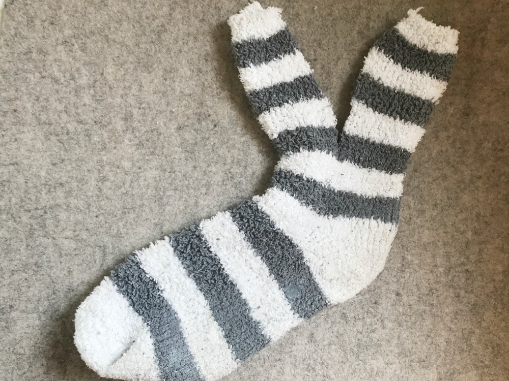 Sucht euch eine alte Socke. Wie ihr unschwer auf dem Foto erkennen könnt, ist meine Socke wirklich ein altes Exemplar. Mit abgewaschenen Antirutsch Noppen und an vielen Stellen schon dünn und nicht mehr farbecht. Ihr seht, für meine Blogartikel scheue ich keine Kosten und Mühe 😉