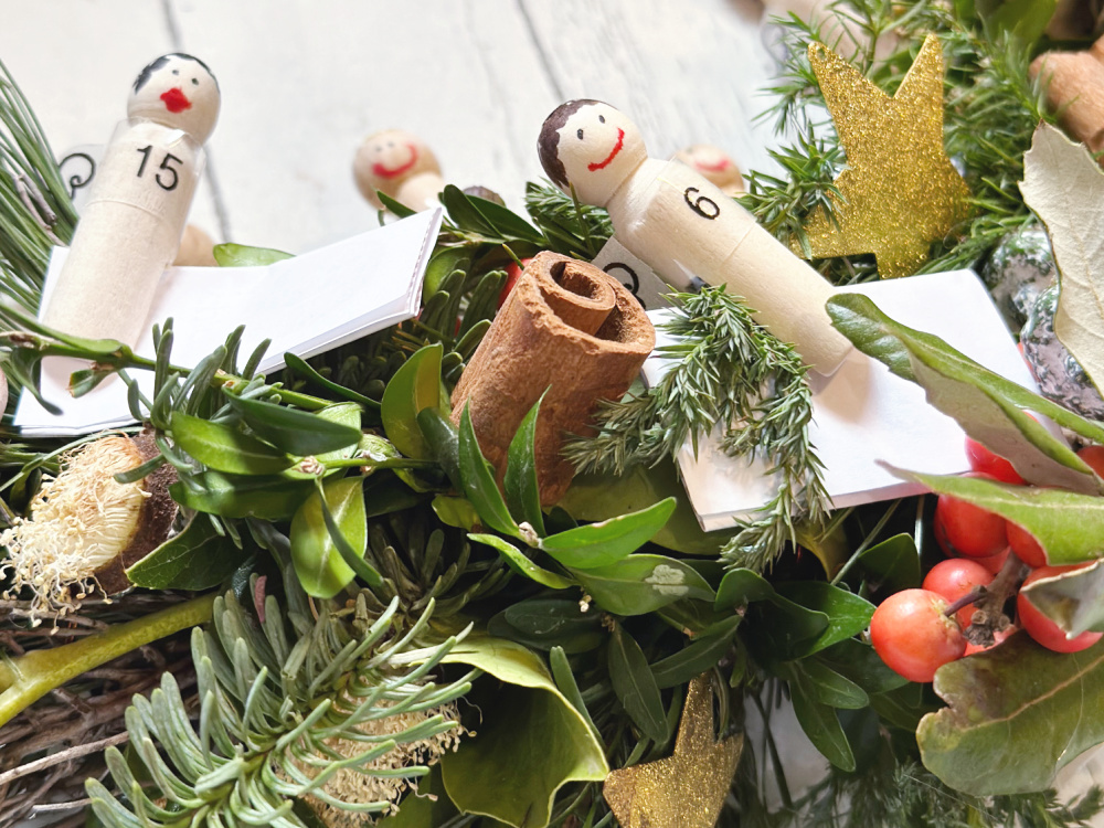 4. Die 24 Zettelchen ausschneiden und zusammenfalten. Jeweils dem Engel mit der selben Nummer zuordnen und an den Kranz klemmen.