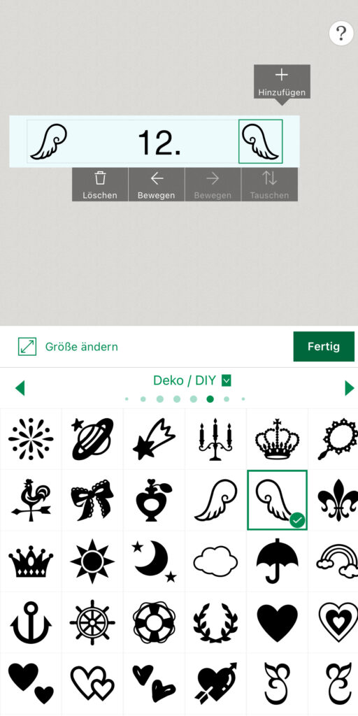 2. Gehe bei deinem P-Touch Cube in das Auswahlmenü und suche in den Cliparts die beiden Flügel aus. Platziere nach dem ersten Flügel sieben Leerzeichen, dann die Nummer des Engels, wieder sieben Leerzeichen und dann den zweiten Flügel. Benutzt habe ich transparentes Band, 9mm mit schwarzer Schrift. Ausdrucken.